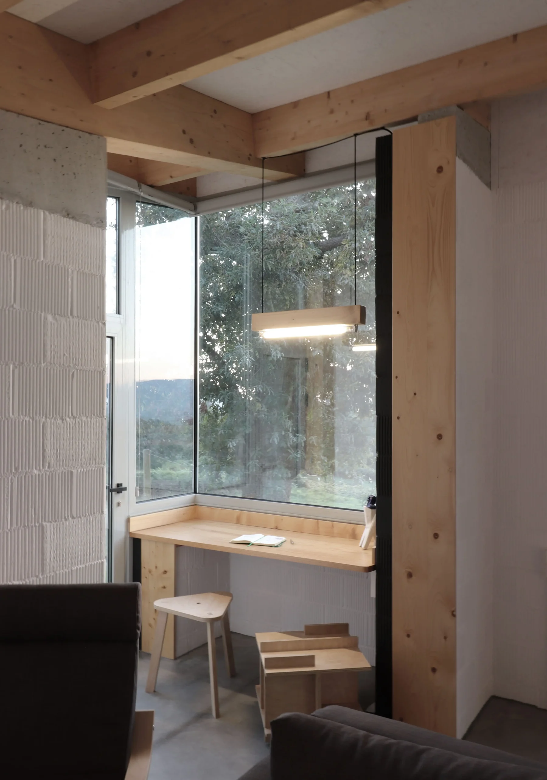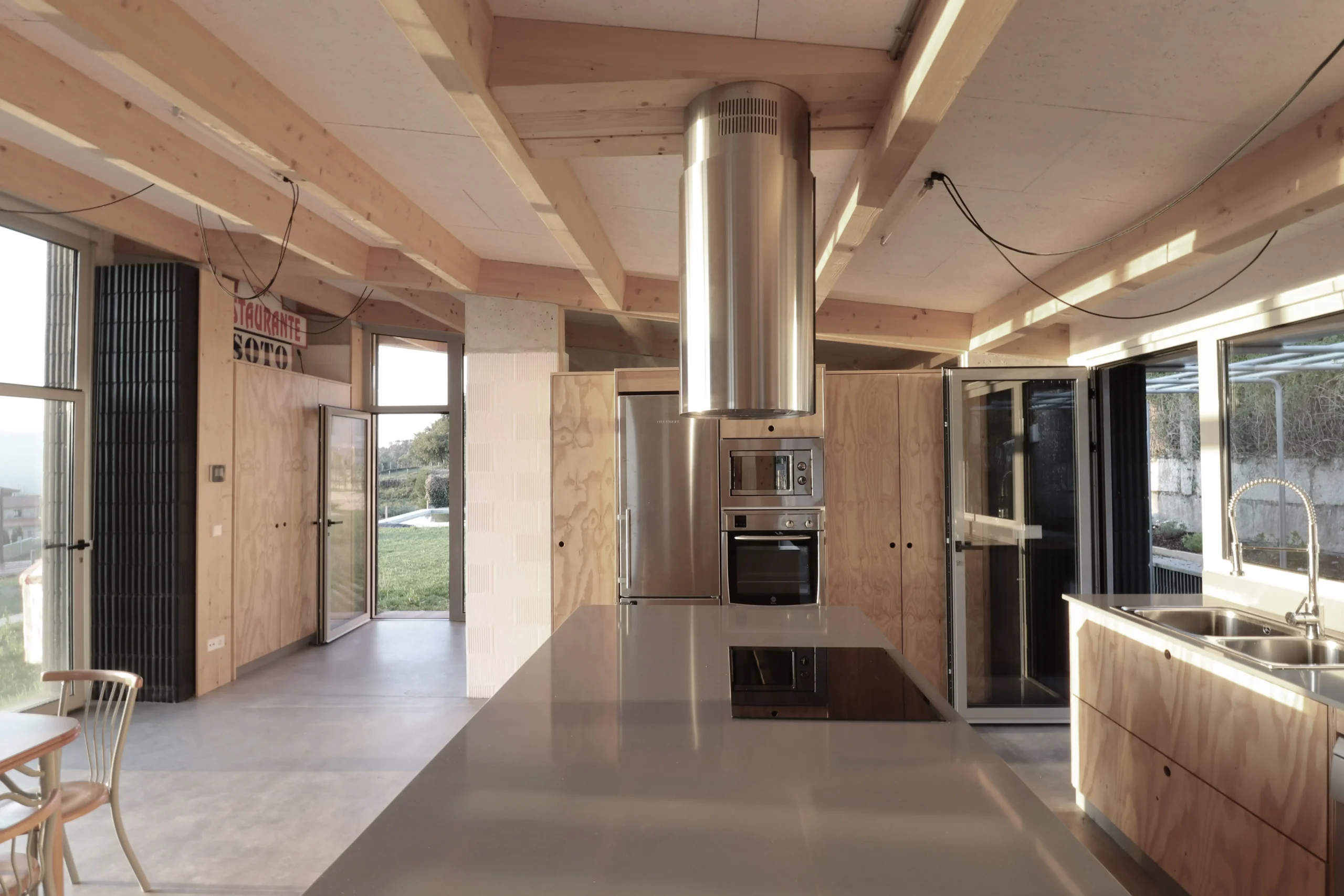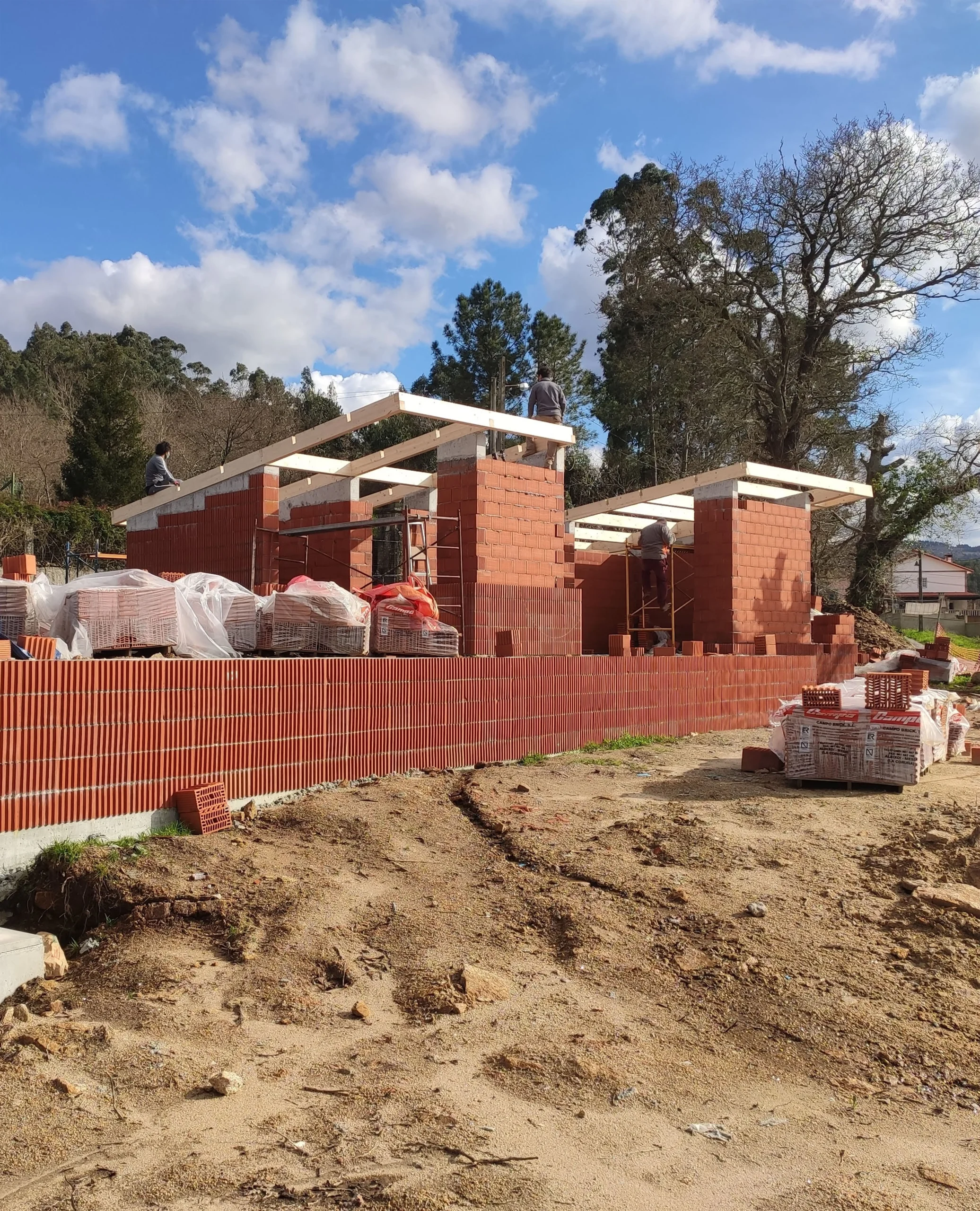 El sistema de muros se ejecuta con doble hoja de termoarcilla, con una hoja interior portante sobre la que se apoya la estructura de madera de cubierta y una hoja exterior autoportante que se deja vista como acabado. Esta solución permite aprovechar las cualidades técnicas y estéticas del material cerámico, aportando inercia térmica, durabilidad y una textura constructiva reconocible en la fachada.