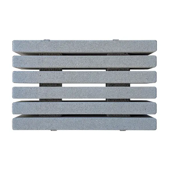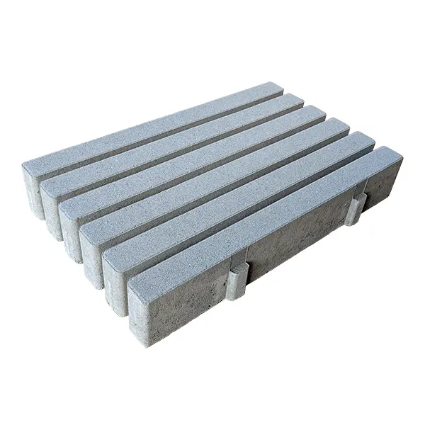 Losa prefabricada de hormigón de 60x40x10 cm (longitud x anchura x espesor), con franjas lineales separadas por huecos que permiten la filtración de agua de lluvia y la incorporación de material granular, como gravilla o granza cerámica. Apta para uso peatonal y tráfico ligero.